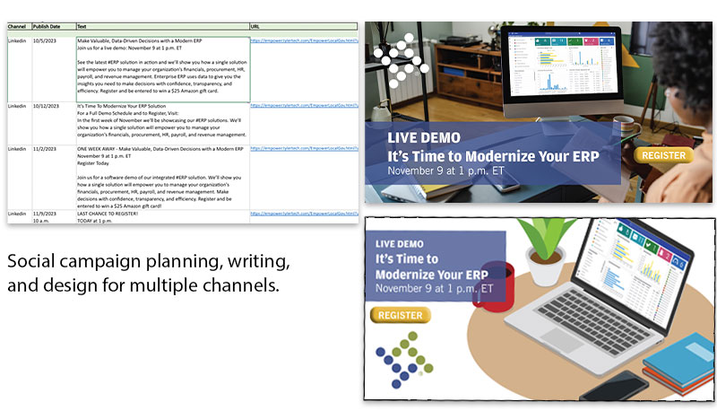 As a vertical marketing specialist for Tyler Technologies‘ ERP software, I work with the organization’s social media team to execute social media plans. Here is an example of the planning and design for promoting a webinar/demo series to prospects.